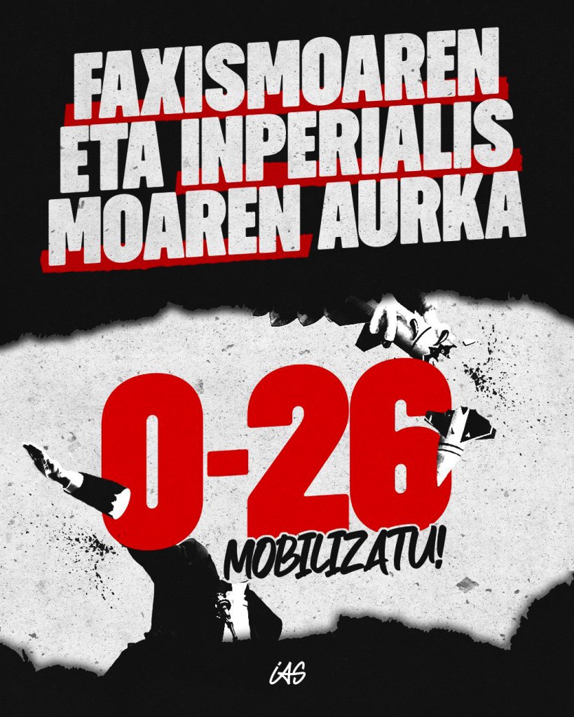 Ikasle Antolakunde Sozialistak (IAS) azken asteotan eskola, ikastetxe, ikastola eta unibertsitate batzordeen, kaleko lanaren eta ikasleen erakundeen bidez gauzatutako dinamika antifaxistarekin jarraitzeko asmoa du. Ikasle langileek faxismoaren aurkako borrokan lehen lerroan egon behar dutela uste duelako IAS. Hori dela bihar, otsailak 26, mobilizazioak burutuko ditu «Faxismoaren eta Inperialismoaren aurka mobilizatu» lelopean.